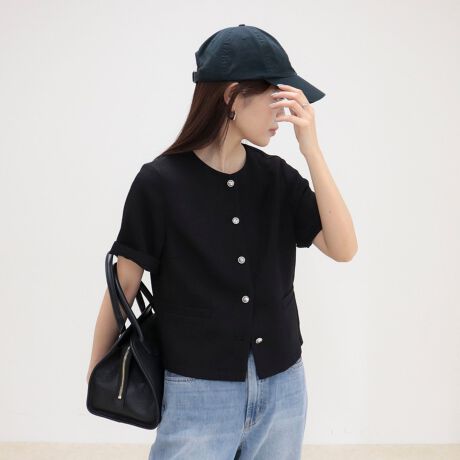 ・すっきりとしたノーカラーデザインで上品な印象に仕上げたハーフスリーブジャケット
