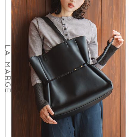 ・縦長フォルムで収納力抜群で、A4サイズにタブレット、ポーチなどもすっきり収まるサイズ感。