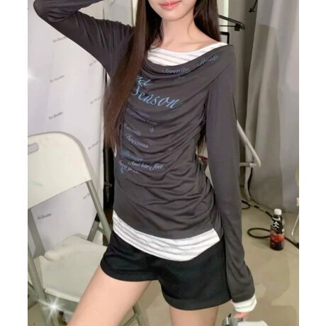 ドレープネックにレタリングデザインを施した、シアーロングTシャツとボーダーインナーのフェイクレイヤードトップス。