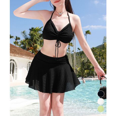 ホルターネックトップスとフレアスカートを組み合わせたセパレート水着セット。