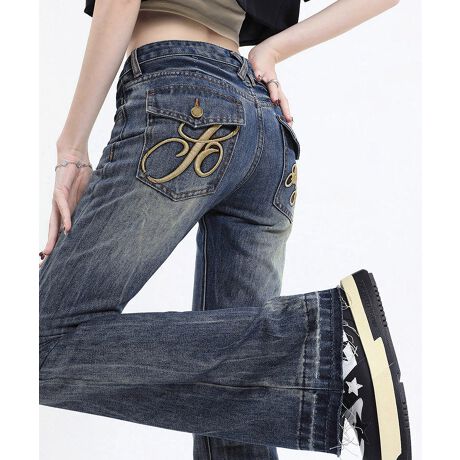 ロゴ刺しゅうフレアデニムパンツレディース