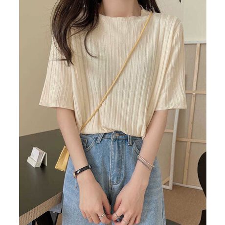 太めのリブデザインが上品な印象を与える半袖サマーニットトップス。