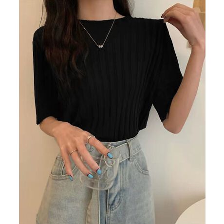太めのリブデザインが上品な印象を与える半袖サマーニットトップス。