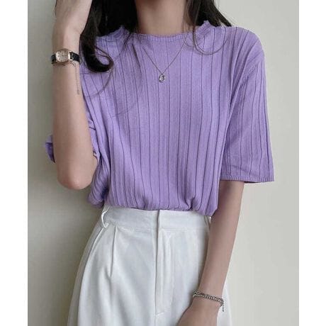 太めのリブデザインが上品な印象を与える半袖サマーニットトップス。