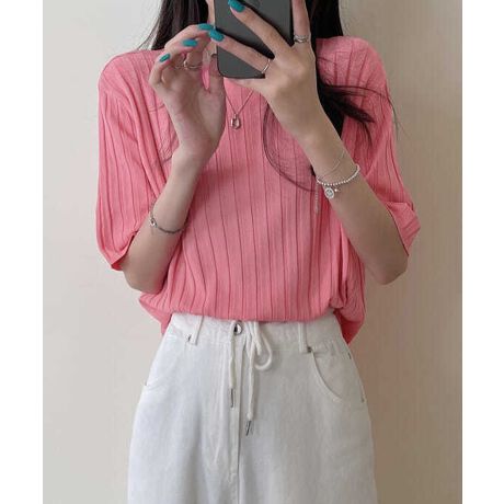 太めのリブデザインが上品な印象を与える半袖サマーニットトップス。