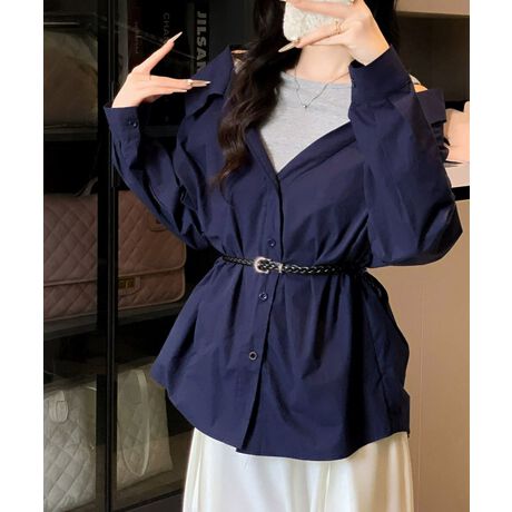 グレータンクトップとVネックシャツを重ねたようなフェイクレイヤードのオフショルトップス。