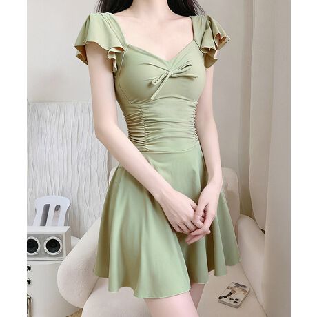 ウエストシャーリングとリボンディテールが目を引く、フェミニンなフレアワンピース水着。