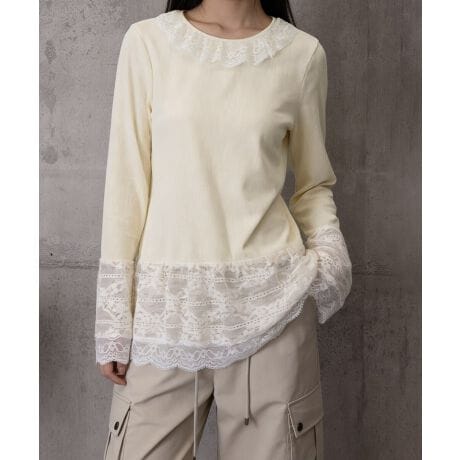 襟元・袖口・裾にレースをあしらった、フェミニンなロングTシャツ。