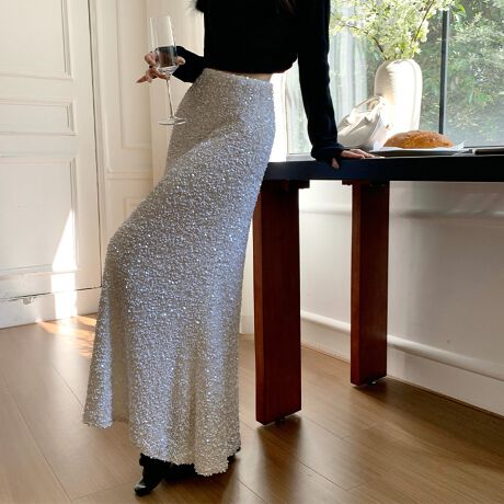 全面にスパンコールを施したロング丈スカートは、動くたびに光を受けて美しく輝く。