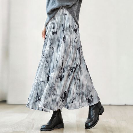 裾に向かって広がるプリーツラインが、動きに合わせて美しく揺れます。