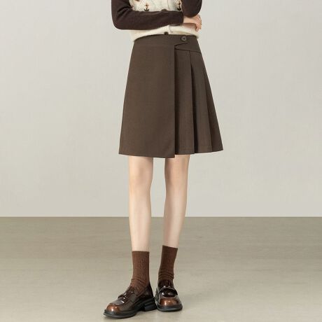 広がりすぎないAラインとプリーツで、脚を細く長く見せます。
