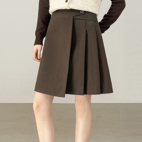 広がりすぎないAラインとプリーツで、脚を細く長く見せます。