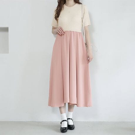 ニットと布帛のドッキングワンピース。◆ポイント・FRONT中央にデイジー刺繍・ボリュームのあるスカートでスタイルアップも・五分袖・スカート部分には裏地付き◆コーディネート忙しいときやコーディネートが苦手な方も一枚で着こなせる嬉しいアイテムです。[型番:226-401902]