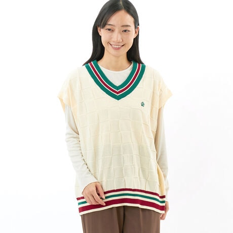 【素材】サラッとした綿の強撚糸を使ったニットベスト。綿素材の肌触りの良さと強撚糸のドライタッチがポイントです。【デザイン】ベースには市松模様のような格子状の立体的な編み柄をベースに衿や裾の大胆な配色カラーが目を引くアイテム。ゆったりとしたワイドシルエットでインナーを選ばずに合わせることができる点も◎。*こちらの商品はユニセックス商品です。【ブランド情報】FRAPBOIS PARK/フラボア パーク<いろいろな人が集まるところ>はじめましてやそうじゃない人にもいろいろなスタイルにいろいろとプラスできるいろいろなアイテムをそろえました。この[PARK(パーク)]レーベルはJOIN/ジョインをキーワードに、いろいろなクリエイターやアーティスト、今、気になるモノ・コトなどを取り入れてアイテムを製作していきます。ジェンダーや年齢をこえたいろいろな人たちにお楽しみいただけるよう、スタンダードなアイテムを中心にサイズ展開の幅を広げています。