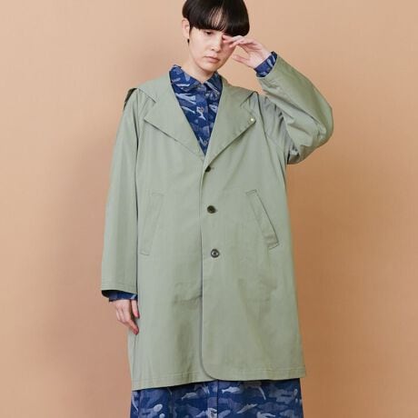 【素材】軽さと丈夫さを兼ね備えた薄手の素材はマットな表面感と適度な光沢感がポイント。【デザイン】ゆったりとしたリラックスシルエットのラグランスリーブのコート。フード状の衿がファスナーによって開閉する面白いデザイン。スナップの第一ボタンを開けるとジャケットのような衿になり、止めるとレインコートのようなスッキリとした雰囲気に仕上がります。*こちらの商品はユニセックス商品です。【ブランド情報】FRAPBOIS/フラボア2001年にブランドスタート。「大人げない大人の服」をコンセプトに、大人が着るリラックスしたデイリーウェアを提案するコレクションブランド。レディースとメンズのアイテムをご用意しています。