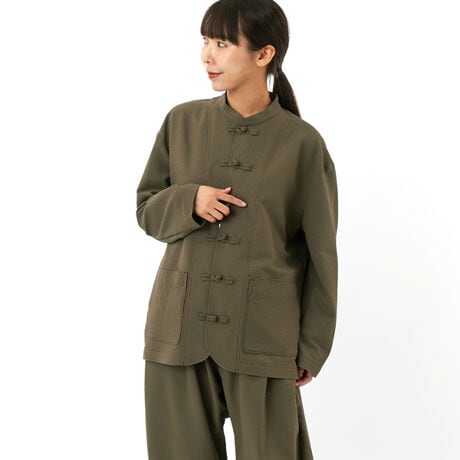 【素材】表面のストライプ状の凹凸感が特徴のサッカー素材はサラッとした肌触りと適度なキックバックがポイント。【デザイン】フロントに入ったチャイナボタンモチーフがアクセントになった軽量ジャケット。素材の持つ適度なハリと軽さが際立った羽織りアイテム。スッキリとしながらもきめ過ぎないラフな仕上がりも◎。同素材のパンツとセットアップとしても着用できます。*こちらの商品はユニセックス商品です。【ブランド情報】FRAPBOIS/フラボア2001年にブランドスタート。「大人げない大人の服」をコンセプトに、大人が着るリラックスしたデイリーウェアを提案するコレクションブランド。レディースとメンズのアイテムをご用意しています。