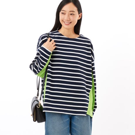 【素材】ザックリとしながらも肌触りの良い綿のボーダー生地と発色の良い無地の生地を組み合わせています。【デザイン】ゆったりとしたワイドシルエットのバスクシャツは広めの袖周りにやや小さめの袖口がルーズ過ぎない雰囲気を作っています。袖口から脇を通り裾口まで繋がった配色がシンプルなボーダー柄にアクセントを作っています。*こちらの商品はユニセックス商品です。【ブランド情報】FRAPBOIS/フラボア2001年にブランドスタート。「大人げない大人の服」をコンセプトに、大人が着るリラックスしたデイリーウェアを提案するコレクションブランド。レディースとメンズのアイテムをご用意しています。