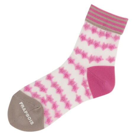 【素材】シアーで繊細な編みに立体的なカットモチーフが特徴のソックス。【デザイン】やや短めの丈はワンピースやスカートなどとも相性が良い点がポイント。シアーで繊細なベースに立体的なカットモチーフの柄がアクセントを出しています。桜の花びらをモチーフにした柄は柔らかで大人っぽい雰囲気に仕上がっています。Fサイズ:22.5〜24.5cm【ブランド情報】FRAPBOIS/フラボア2001年にブランドスタート。「大人げない大人の服」をコンセプトに、大人が着るリラックスしたデイリーウェアを提案するコレクションブランド。レディースとメンズのアイテムをご用意しています。