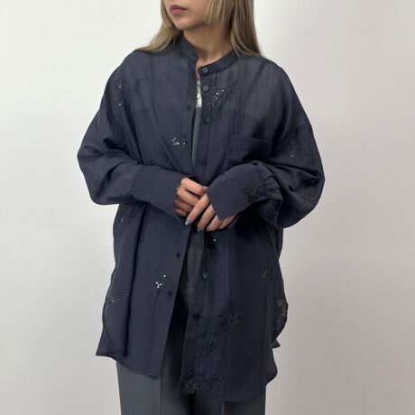 花の刺繍とところどころキラッと光るスパンコールが高級感を演出しほどよい透け感がオーバーシャツを軽やかに見せてくれます。
