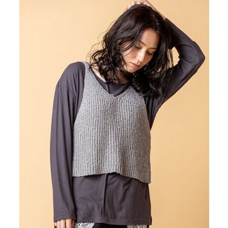 重ねるだけで新鮮なスタイリングが完成するビスチェは、ニット素材で抜け感を演出。