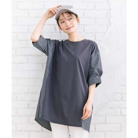 シルケット素材のなめらかな風合いに、ストライプ布帛を組み合わせたコンビデザインのチュニック。