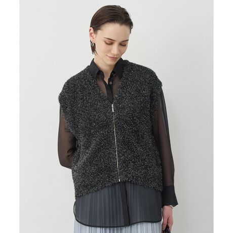 ■デザイン華やかなファーニット素材×ジップアップ仕様で、洗練された印象のニットジレです。カジュアルにもきれい目にもシーンレスで着用できるようなデザインに拘っています。肌寒い時期の体温調整にも便利なので、早めから準備していただくのがおすすめです。ジャケットINに着ていただいたり、シャツやカットソー、ワンピースとのレイヤードスタイリングなど着回し力抜群。キャミソールなどのインナーを入れノースリーブトップスとしても着用可能で長いシーズン活躍します。
