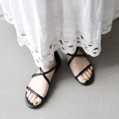 足首でクロスする華奢なストラップが、足元をすっきりと美しく見せてくれるサンダルです。