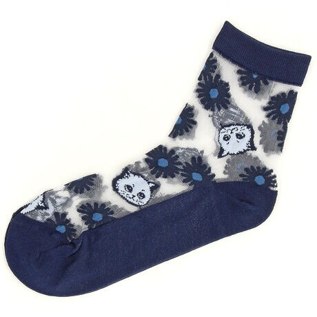 [型番:PJL663079-]猫と花が散りばめられたシースルーのロークルーソックス。サンダルに合わせて履くのがおすすめ。足底は綿素材なので、足汗にも安心です。
