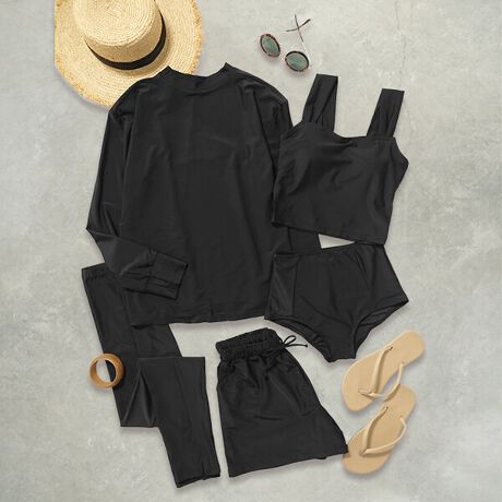 ラッシュガード、タンキニ、ショーツ、ショートパンツ、レギンスの5点セットです。