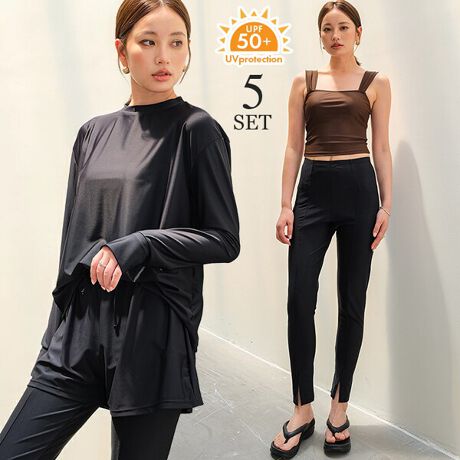 ラッシュガード、タンキニ、ショーツ、ショートパンツ、レギンスの5点セットです。