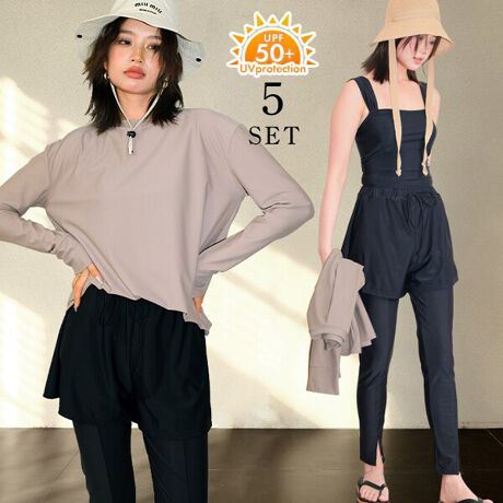 ラッシュガード、タンキニ、ショーツ、ショートパンツ、レギンスの5点セットです。