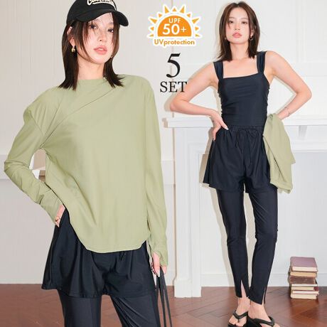 ラッシュガード、タンキニ、ショーツ、ショートパンツ、レギンスの5点セットです。