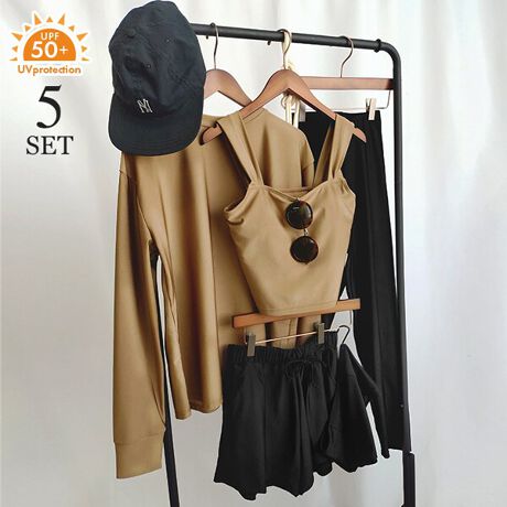 ラッシュガード、タンキニ、ショーツ、ショートパンツ、レギンスの5点セットです。