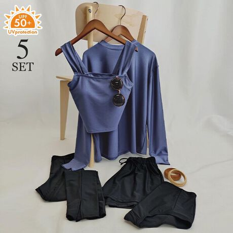 ラッシュガード、タンキニ、ショーツ、ショートパンツ、レギンスの5点セットです。