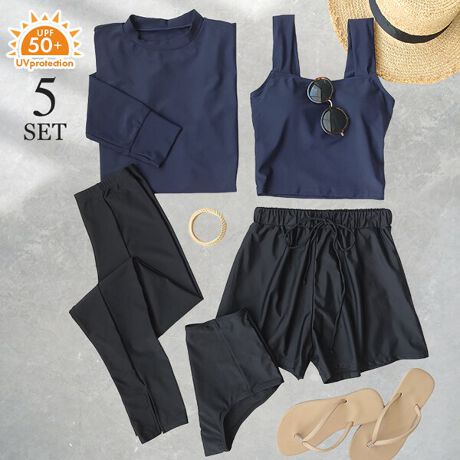 ラッシュガード、タンキニ、ショーツ、ショートパンツ、レギンスの5点セットです。
