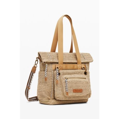 取り外し可能なバッグ、さまざまなストラップ、多機能効果、大きなラフィア製バックパック、ロゴが刻印されたレザー調タグ付き。