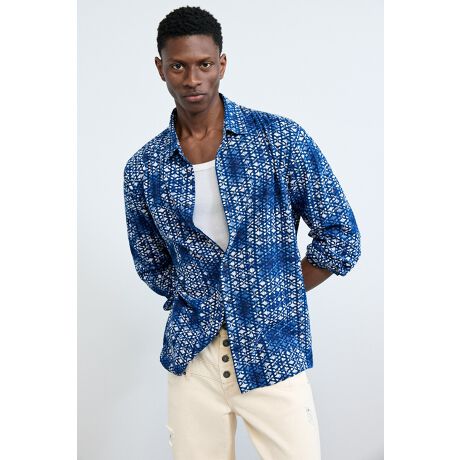 長袖シャツ、ブルートーンのタイダイプリント。クラシックなシャツカラーとフロントボタン留め。刺繍入りデザインの生地。