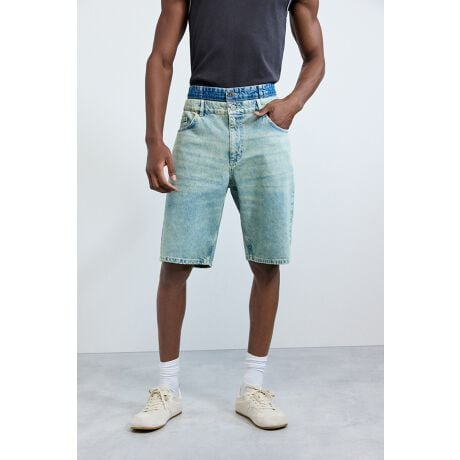 ボタンとファスナーのコンビネーション留めと伸縮性のあるウエストバンドを備えたコットンデニムのバミューダパンツ。5ポケット仕様で、ライトブルーのウォッシュ加工生地を使用しています。