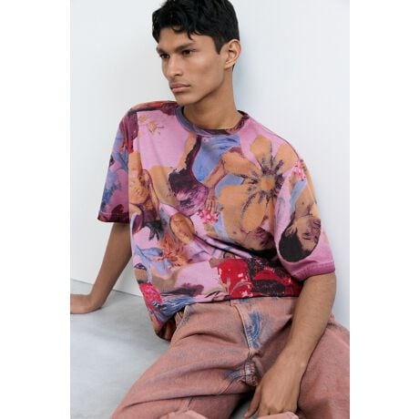 赤とピンクのトーンの抽象的なプリントが施された、100%コットンジャージー素材の半袖Tシャツ。ラウンドネックで、ストレートカットです。