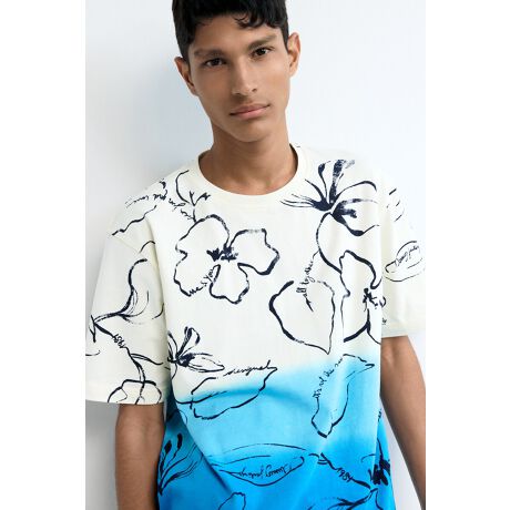 コットンジャージー生地の半袖Tシャツ。生成りからブルーへとグラデーションになったフローラルプリントが施され、ラウンドネックとストレートヘムが特徴です。