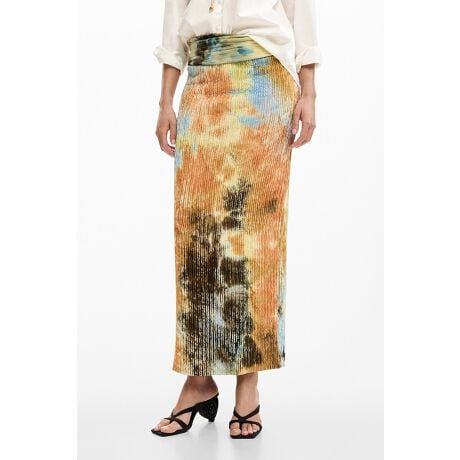 細かな皺感のあるテクスチャー生地と抽象的なプリントで仕立てられた、タイトなスタイルのロングスカート。