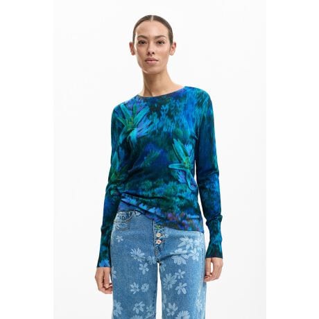 レギュラーフィットの薄手ニット、丸首、暗い色調の花柄プリント。