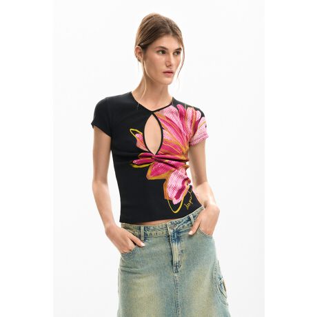 胸元にスリットがあり、前面に大きな花柄がプリントされたリブ素材の半袖シャツ。