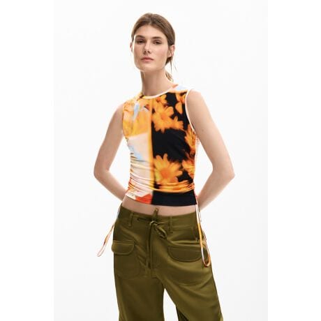 スリムフィットのノースリーブTシャツ、サイドに調節可能なリボン付き、花柄プリント。