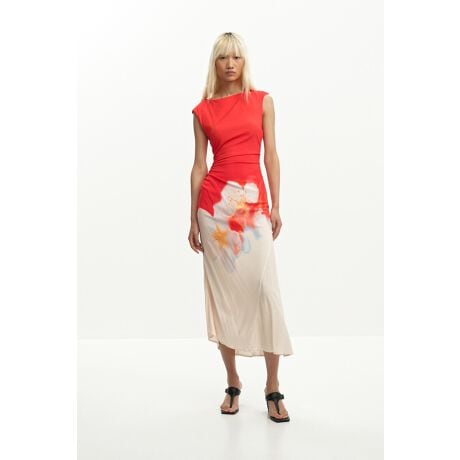 花柄プリントが施された、2色デザインのノースリーブミディドレス。サイドウエストから放射線状に入った、流れるようなドレープが美しいシルエットを生み出しています。