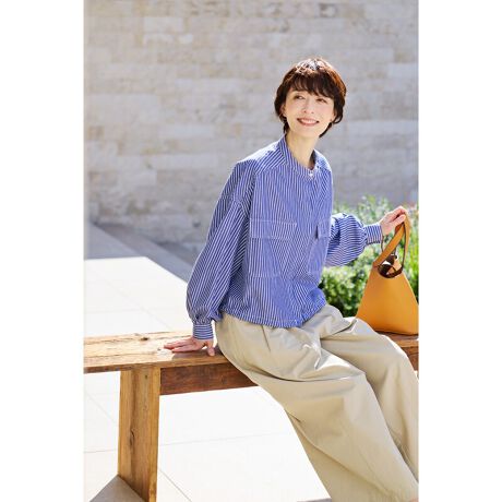 [型番:53293]さわやかなストライプ生地でふんわり今どきシルエットのシャツジャケット。短い丈でどんなボトムスとも好相性。前を開け閉めしたり、裾のドロストコードを絞ったりと、さまざまな着方を楽しんでいただけます。素材/綿100% 中国製 手洗い