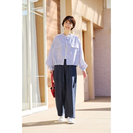 [型番:53293]さわやかなストライプ生地でふんわり今どきシルエットのシャツジャケット。短い丈でどんなボトムスとも好相性。前を開け閉めしたり、裾のドロストコードを絞ったりと、さまざまな着方を楽しんでいただけます。素材/綿100% 中国製 手洗い
