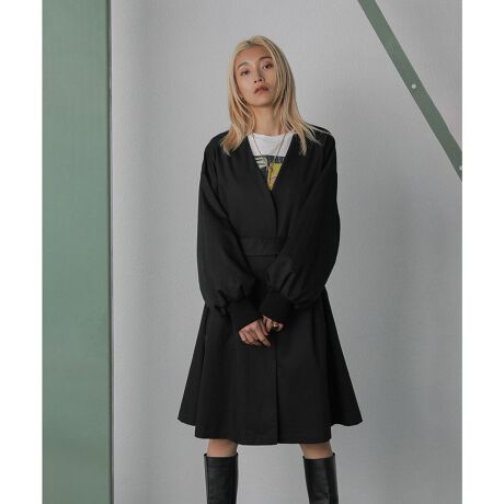 モードなシルエットとカジュアルなディテールを併せ持ったノーカラーコート