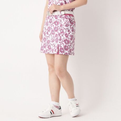 この夏映えゴルフスカートは、陶器模様を思わせる上品なワントーンのひまわり柄が特徴です。