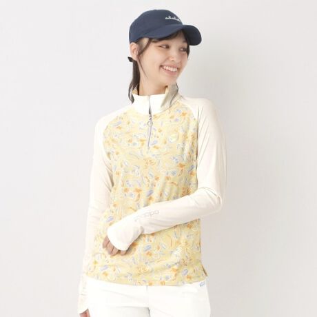 このゴルフトップスは、風と花をイメージさせるラインアート風のオリジナル花柄が女性らしさと爽やかさを引き立てます。